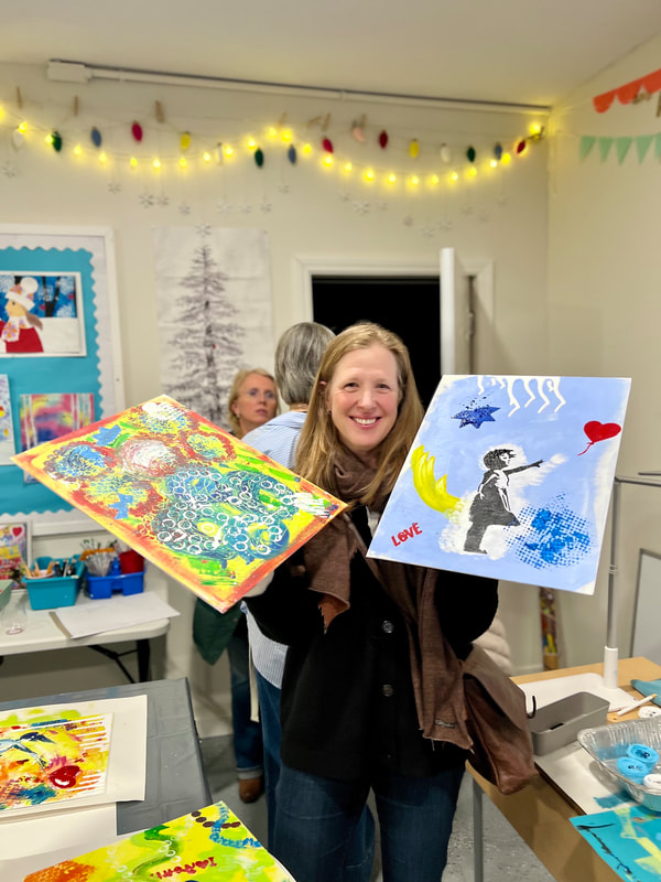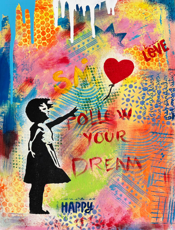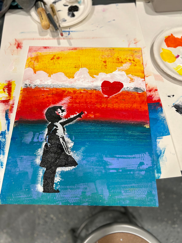 Banksy Balloon Girl: explore making textures with an abstract background and either free draw or use a stencil for the "girl". Adult Birthday art party: super fun!!!!