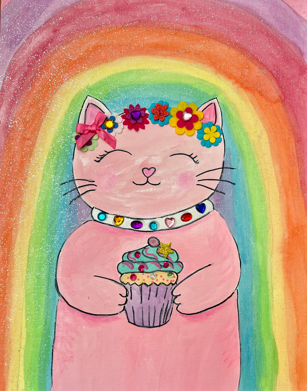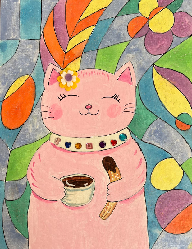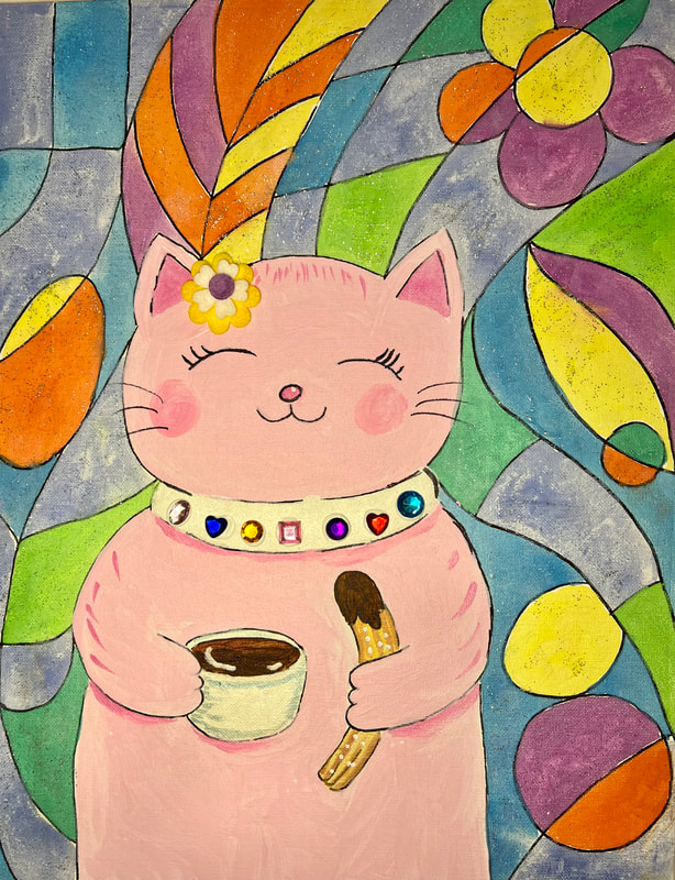 Birthday art party: cat with churro, hot cocoa and a stained glass background.